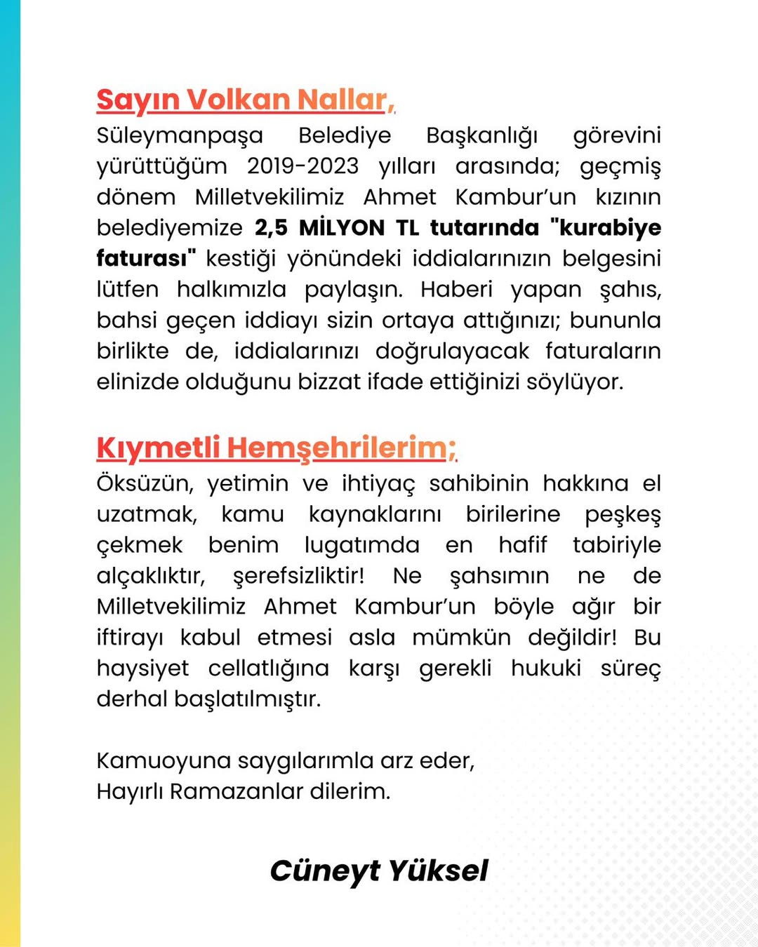 Cüneyt YÜKSEL Süleymanpaşa Belediye Başkanlığı dönemindeki ithamlara,kensi sosyal medya hesabından paylaşım yaptı.